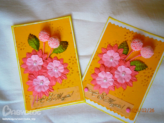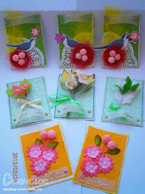 Подружка у меня занимается букетами из конфет и попросила меня наделать маленьких открыток, которые она будет ложить в букеты. Одну партию уже продали. Сегодня сделала вторую. Все открытки 10х7 примерно.