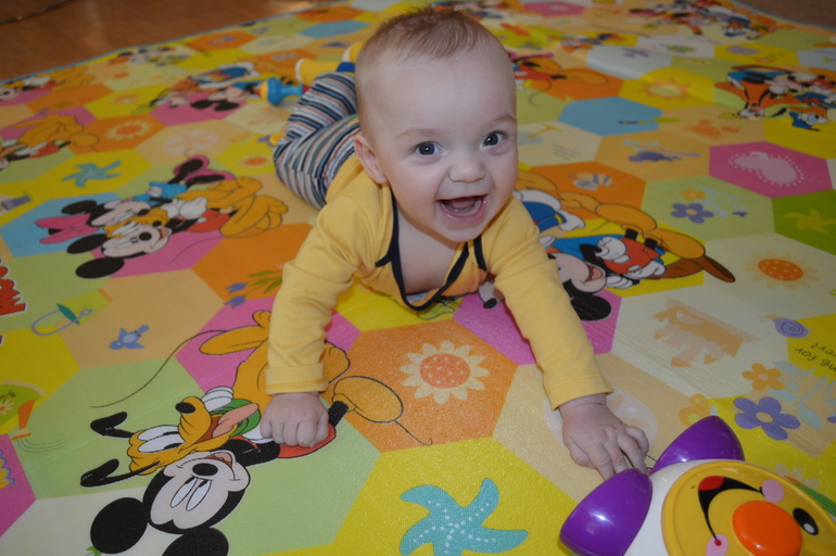 Зато любим яркий игровой ковер по которому ползаем на пузе, шуршалку-гремелку собачку скип хопп, дугу от тини лав за которую можно дергать и будет крутиться вертелка и самая сейчас большая любовь плеер от тини лав, догадался ведь как работает бьёт ручкой и включает себе музыку )