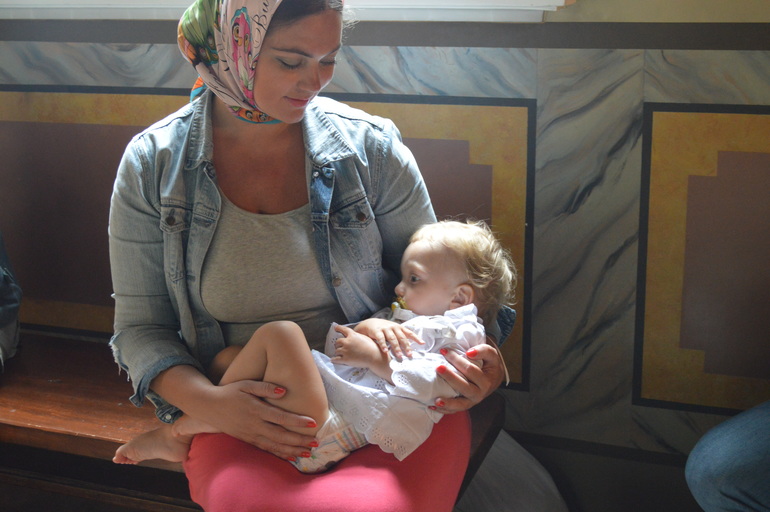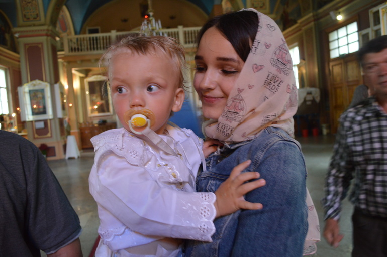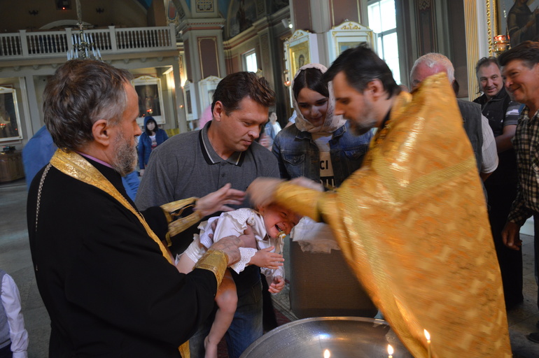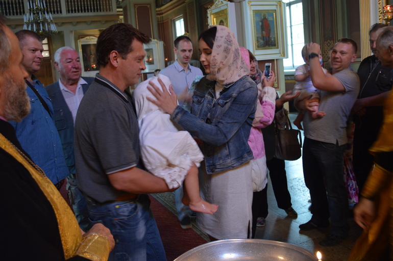 Когда опускали плакал конечно ) а так вел себя хорошо, в храме красиво, свечи горят, ему понравилось)