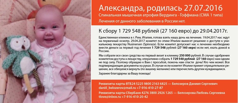 Моя девочка родилась с очень редким заболеванием СМА с агрессивной формой 1 типа. Лечения в России нет. Без лекарства нет шансов. Я вынуждена просить помощи у людей, так как самим нам не справиться.