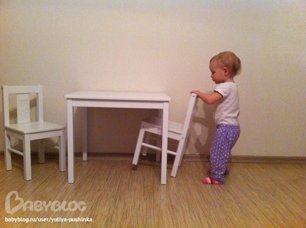 Выбирала долго! То, что нравилось, стоило дофигаааа, а то, что подходило по цене, все было разрисовано Дашей, Машей, Тачками.... а я такого вообще не люблю. В итоге заказали икеевский, столик и два стульчика. Вчера папа привез наше счастье! Настена была очень рада!