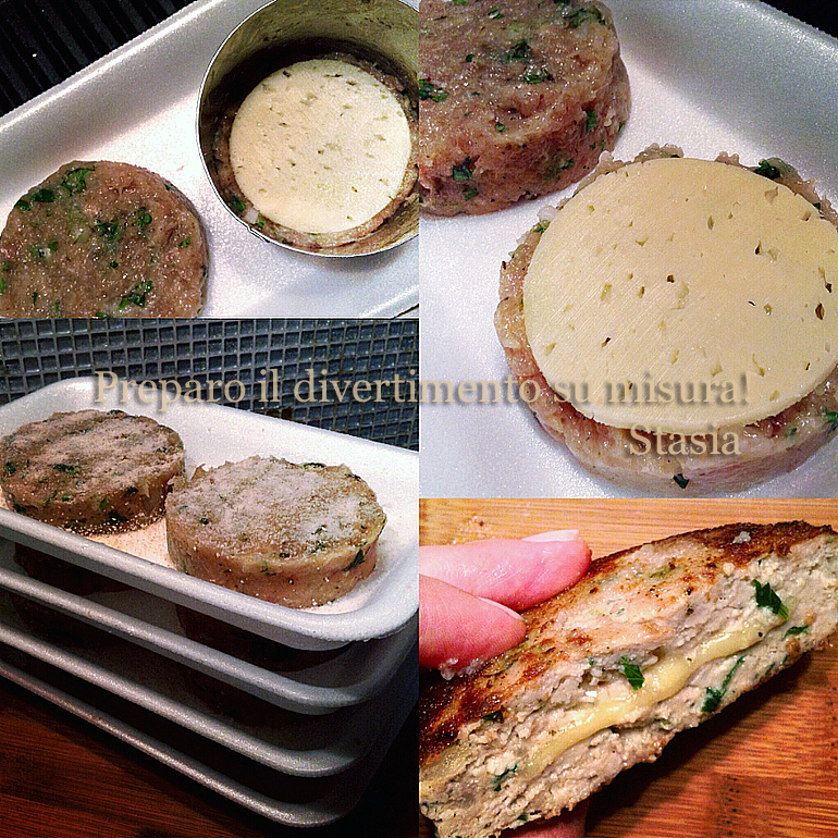 Выложить в форму 60 г фарша, сверху положить кружок сыра меньшего по диаметру (~6-9 г), сверху еще 60 г фарша, разровнять ложкой. Затем аккуратно снять кольцо и выровнять поверхность ножом. Можно присыпать панировочными сухарями.