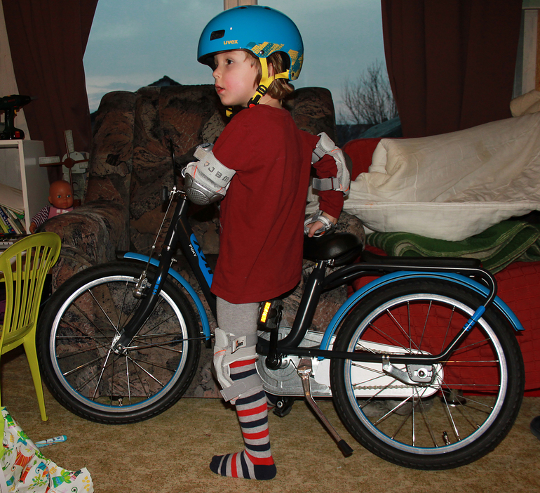 А когда пришел старший брат, он ему подарил к велосипеду шлем и защиту на руки и ноги