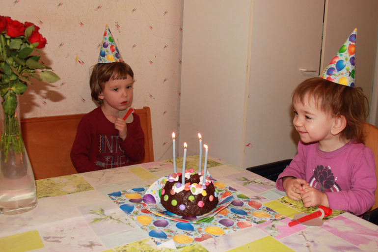На следующий день отпраздновали в кругу родных, два Серёжиных брата, один с семьёй, дедушка и прадедушка. Подарили заказанные мной подарки две книги для ручки TipToi и машину от Playmobil.