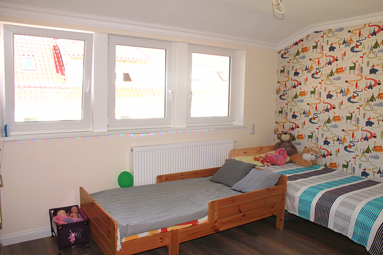 Про батарею, зная что в России любители обсуждать кровать у батареи. Топим мы в нашем частном доме дровами в камине, а центральное газовое отопление в подвале.Так вот 2 спальни на 2-м этаже - детская и взрослая хорошо отапливаются грубой(трубой), в детской это кусок свободной стены справа от двери, поэтому регулируемая батарея будет включена на 1-2 из 5 , исключительно комнатной температуры, чтоб ледяной не была. Поэтому кровати так и стоят. На противоположную сторону ногами к двери ни я, ни муж кровать не хотим. Затем комната на двоих временно, как сделаем вторую детскую, одна кровать уйдёт и станет письменный стол как раз под окно. А сейчас им стол в этом возрасте не нужен, играют на полу. Всё творческое на первом этаже. Даже за этим маленьким я их почти не видела, скоро я и его уберу и поставлю там виг-вам.