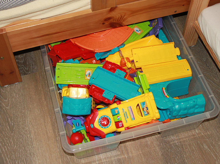 Под кроватью один большой ящик с крупным конструктором железная дорога и большая пожарная машина.