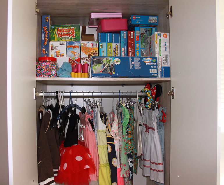 Плательный шкаф в основном для дочкиных выглаженных платьев и верхняя полка для особых игр только под присмотром со мной.