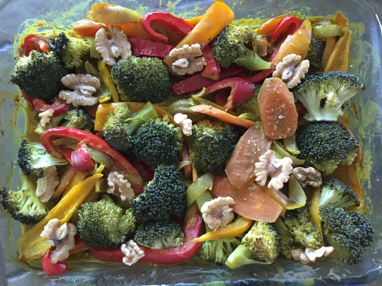 Готовые овощи сверху посолить и поперчить, разложить орех. Я орехи пока не ем, это мужу, а себе в тарелке сверху немного ореховой пасты подлила.