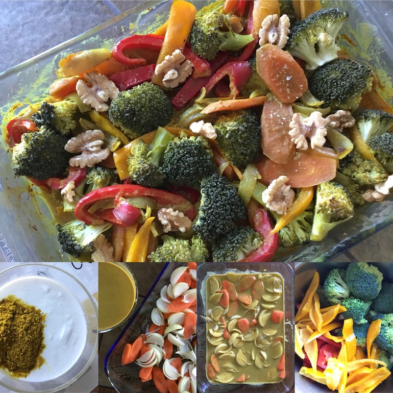 2. Нарезать лук и морковь. Сложить в форму для запекания, залить подготовленным кокосовым молоком с куркумой, перемешать, накрыть фольгой поставить в предварительно нагретую до 200гр. духовку. Выпекать 45-60 мин.