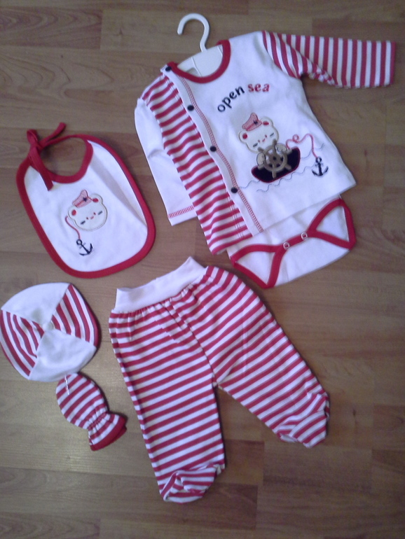 Продам абсолютно новый комплект морячок,срстоящий из 6 предметов: кофточка на кнопках, бодик, штанишки, царапки, беретка, слюнявчик. Нам подарили,ошиблись с размером(