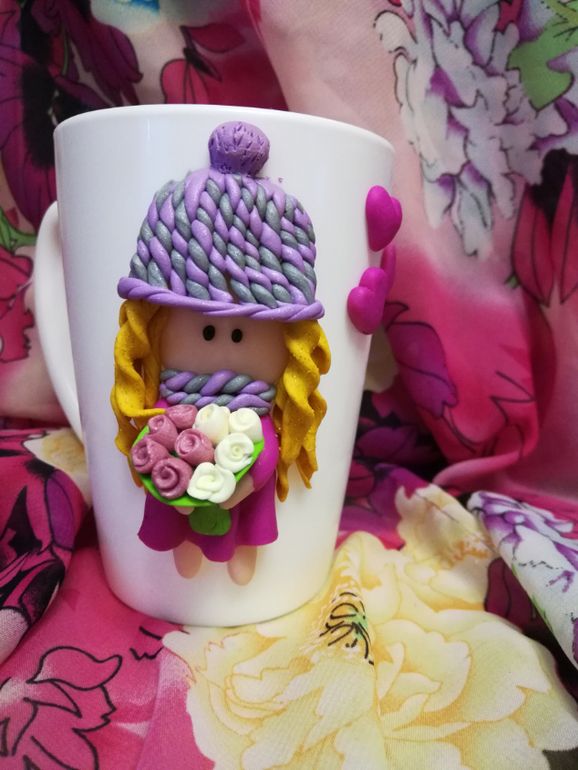 Вот и мне захотелось попробовать создать чашечку с девочкой из полимерной глины. Делала её на день рождение племяннице.