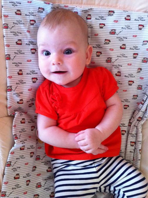 сейчас мы уже совсем большие: смеемся, пищим визжим, говорим " мамммма", переворачиваемся всячески, на животе "живем", поворачиваемся вокруг своей оси, встаем на кулачки, иногда на коленки, стали бить игрухами все, что под руки попадается, ну и многое другое, о чем позже, в следующих постах!