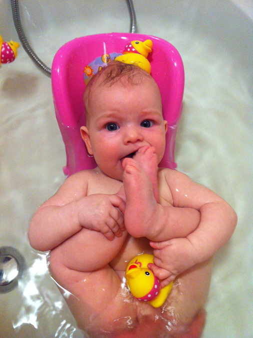 Купаться-плескаться мы полюбили с первых дней жизни, жаль только круг давно не используем - активность в воде такая, что боимся, как бы дельфинчик не выпрыгнул из ванной!