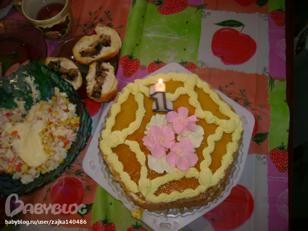 Получилось не так как хотелось.....Тьорт заказать не успели...Доча уснула не успев задуть торт и сфотографироваться с родственниками.Папа нас напугал(лопнул шарик),поэтому с шарами фотографий не получилось.Вот так.....