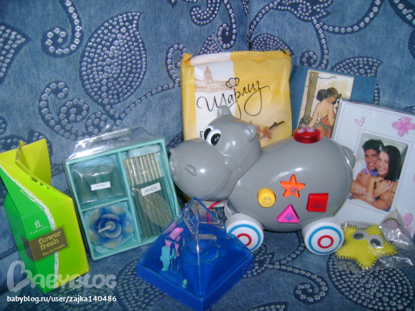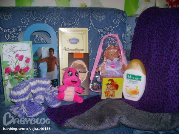 От феечки папа:"получил набор для душа", доча:"мягкого дракошу, музыкальную куклу,пинетеи, кубики,я:"шарф и гель для душа,а вся наша семья сладкий подарок(торт вафельный и шоколад).Большое спасибо феечке Maxim1801.Нам очень понравилось)))