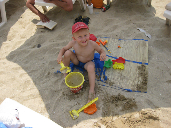 По приезду первым делом окунулись в бассейн - у ребенка восторг, но поначалу боялся и висел на мне как обезьянка ))) В море дело обстояло хуже - его он испугался больше чем бассейна, там небольшие волны, и еще в тот день водоросли были - в общем совсем с меня не слезал.