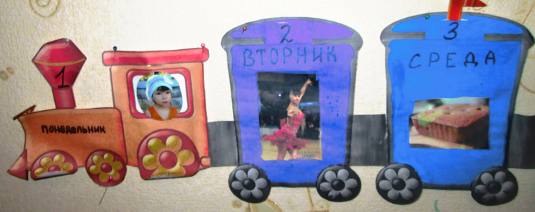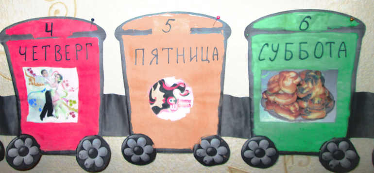 А чтобы легче было запоминать, наклеила на вагончики картинки с изображениями того , чем будем заниматься в этот день (Фото под катом).