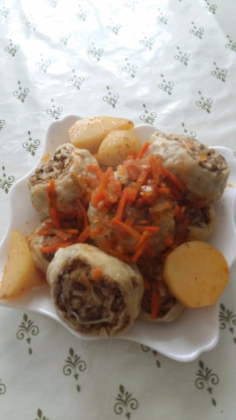 zayka → кухня Новенькая Спам Мама пятерых (от 4 года до 18 лет) Грозный мясной рулет Не знаю как это называется, но было вкусно. В высокой сковороде приготовила зажарку, сверху половинками картоху, залила на 1-2 см водой, сверху положила дольки рулета мясного и под крышкой на медленном огне парить до готовности. Усе. Зелени, для красивой подачи, в доме не нашлось. Читать далее