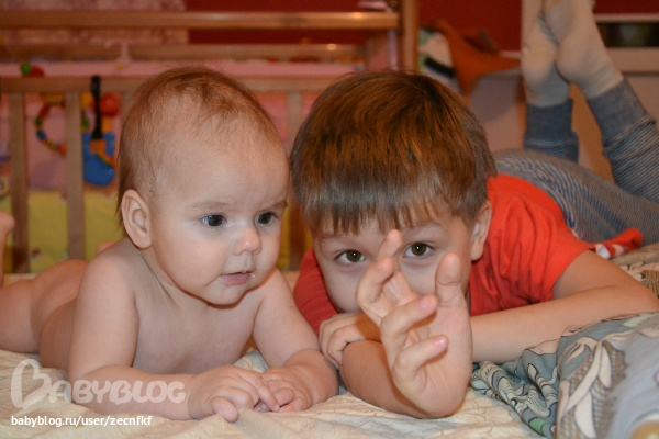 С Толиком любит быть!)) Правда он в основном занимается своими делами, хотя иногда и играют вместе) А она липнет к нему, обнимает, пытается целовать)) А ещё балдеют, когда Толик щекотит её, или выдувает воздух в пузик Наде))