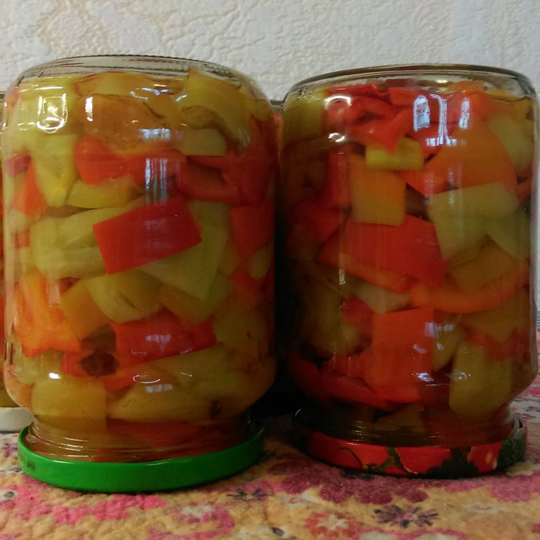 Перец нарезать кубиками, залить водой и поставить на огонь. Варить после закипания 10 мин. Выложит шумовкой без воды в стерилизованные банки, залить кипящим маринадом и закатать. Перевернуть вверх дном, укутать до полного остывания.