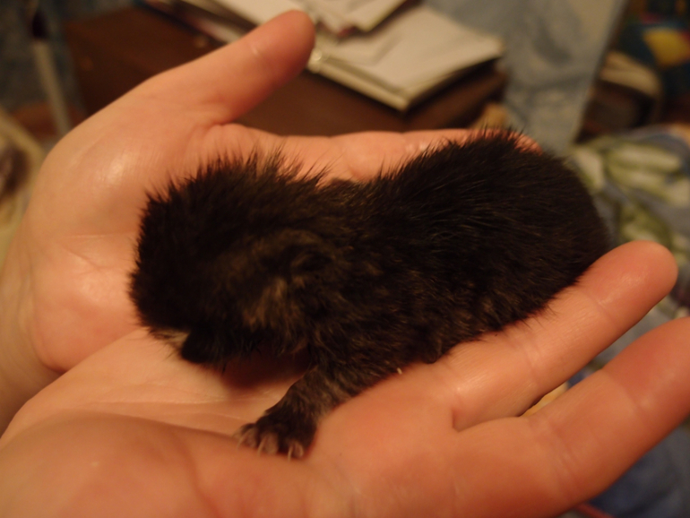 Позавчера нам подкинули к подъезду новорожденного котенка. Еще даже пуповина не отпала. Маленький, слепой, но крепкий - пищит громко)