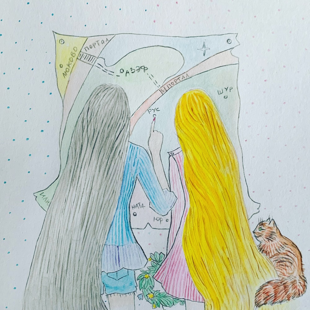 С превеликим трудом (рука немеет при беременности) отрисовала парную обложку к синглу (пока только рисунок). Первый был посвящен ушедшим детям, а второй - ушедшим родителям. На первой обложке мои персонажи Люция и Лилит (Свет и Тьма) в облике Русланы Коршуновой и Шуры Петровой, плюс мой кот детства Рыжков. На второй - мама мужа и он сам маленький. Это фантастические миры, открытая вселенная, где смерти нет.