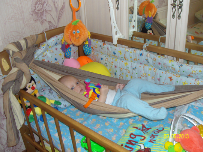 Здорово))) первая фотка - возьму на заметку) мы с мужем вечером ребёнка в пеленку большую кладем и качаем вдвоем, а так можно к кроватке примотать и мне если что днём покачать)))