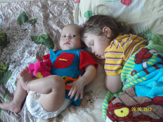 уложила детей спать на дневной сон....тишина....захожу в спальну и.... картина маслом!.... Аришка спит - сопит, а Родька рядом с ней лежит тихонько и играет...