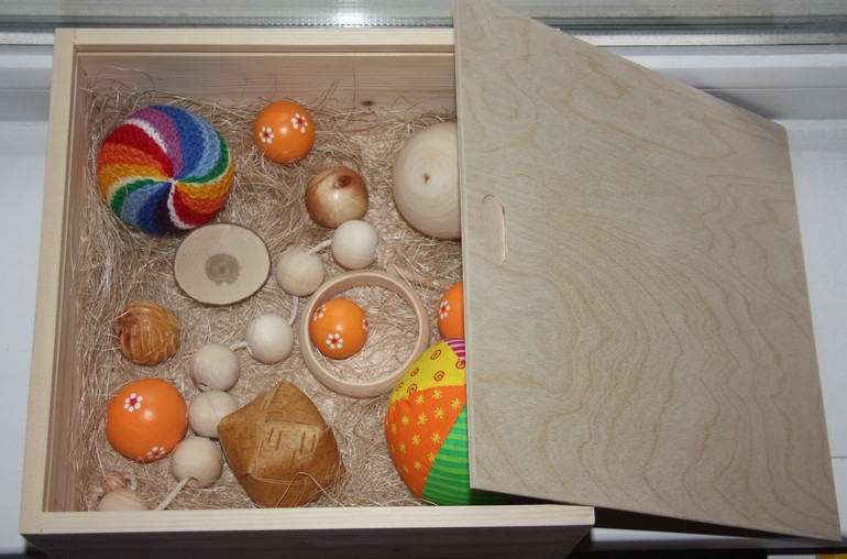 Почему эта коробочка так важна и так дорога для меня? Потому что она вызывает прямые ассоциации с моим сынишкой, который очень любил мячики, шарики и всё круглое. Он развивался вместе с ними, мало того, что они оказывают прекрасное воздействие на слух, игра с мячиком (самое древнее увлечение малышей) очень хорошо развивает координацию и моторику ребёнка. А эта коробочка содержит мячики всех сортов не только в плане материалов, но и в плане звучания. Долго же я думала над тем, какой она должна быть в идеале. И вот дитя моих мыслей. Самая моя любимая коробочка, которая радует зрение, слух, и тактильное восприятие.