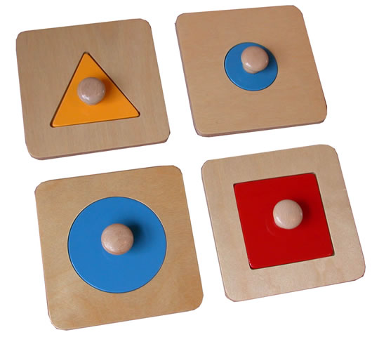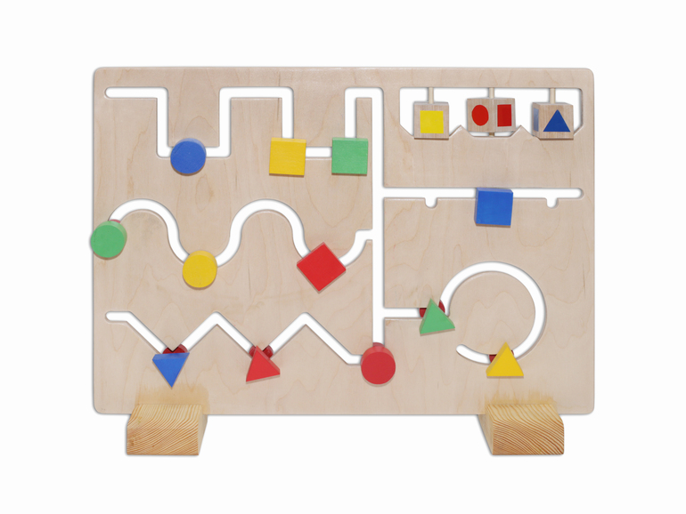 Деревянная доска с различными видами прорезей на подставке, с 3-мя геометрическими фигурами, окрашенными в 4-е основных цвета.