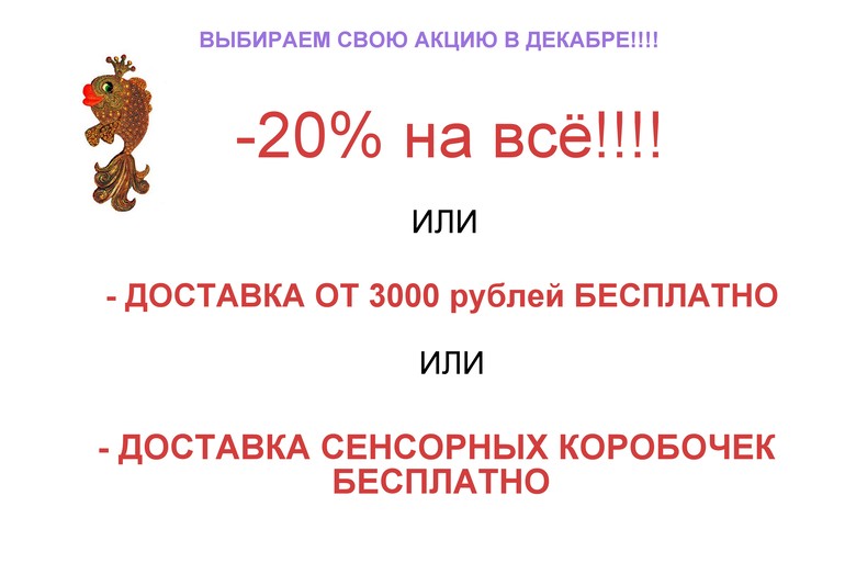 Только в декабре вы имеете возможность сделать выбор в пользу любой понравившейся вам акции !!! Скидка на любую позицию в 20 процентов (для игрушек в наличии, смотрим каталоги на ББ ,контакте, инстаграмме), бесплатная доставка почтой России по территории РФ при заказе на сумму от 3000 рублей или бесплатную доставку сенсорной коробочки!!!!
