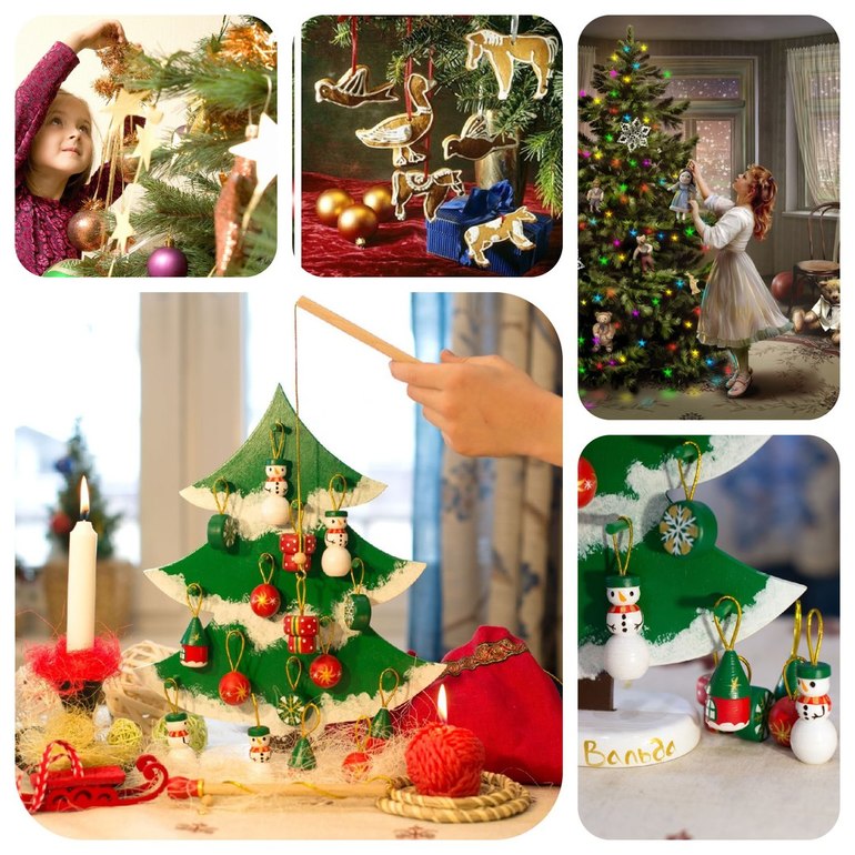 Позднее на ёлку стали вешать искусственные украшения, сладости и орехи.