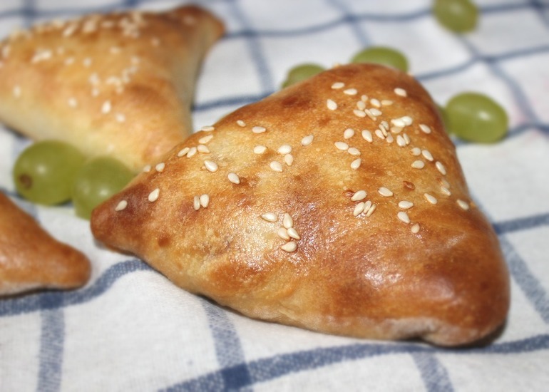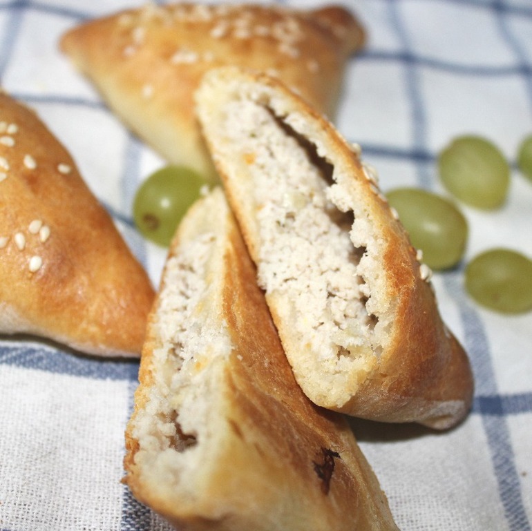 Каждый кусочек руками или скалкой раскатать в круг (тесто такое податливое, что я руками круги делала), выложить начинку и слепить треугольный пирожок. Можно придать пирожкам другую форму, если хотите.