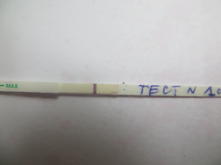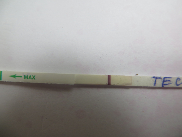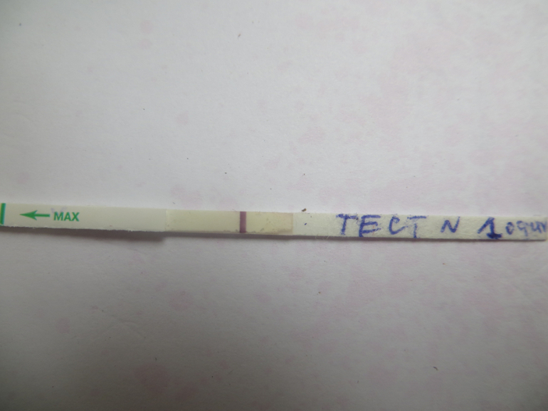 В течении минуты появилась контрольная яркая полоска.Второй полосочки нет,ну это и понятно.На месте второй полосочки наблюдается слабый реагент(полоска тонкая,серая,наблюдается под определенным углом,или под лупой)