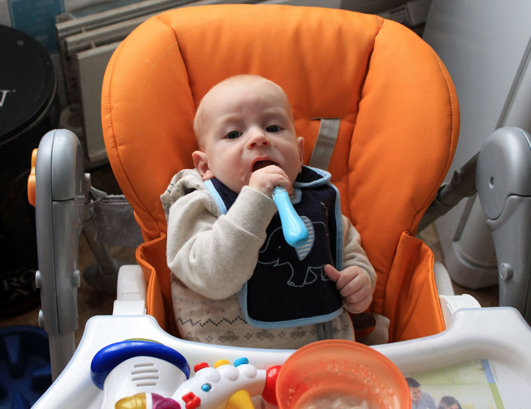 Молодец какой:) А у меня деть отнимает ложку и чешет ей десны:) Жду когда отдат обратно чтоб кормить)