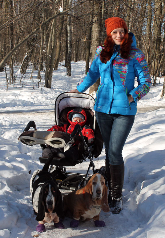 Собаки в ботинках! ))) хихихи :)а что у вас за коляска? :)а у вас не холодно? мама так легко одета :)))мама прекраааасно выглядит ))