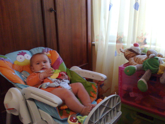 Ну да у нас просто места много.У нас манеж,ходунки,развивающий коврик,стульчик деревянный ,в коляску её сажаю,так же ,как в стульчике получается,но она у меня сама по себе очень спокойная,ей всё равно,куда её положат:)))