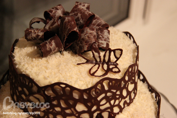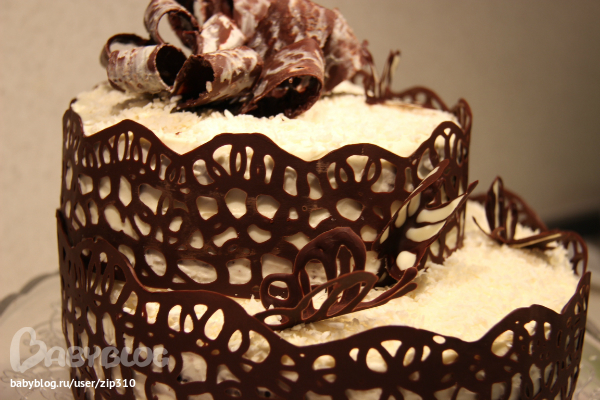 И бант. Вырезала полоски из бумаги для выпечки, намазала шоколадом, соединила концы (шоколад внутри) и в холодильник. Потом бумагу сняла и получившиеся петельки выложила в виде банта. Мне надо было торт перевозить, поэтому на всякий случай намазала стыки "лепестков" растопленным шоколадом.