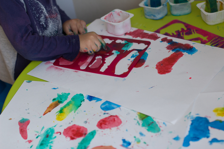 А вот с трафаретами дело обстоит совсем иначе, этим мы можем заниматься очень и очень долго, жалко, что трафаретов у нас не так много...транспорт, овощи, дикие животные и морские обитатели...Трафаретили мы с помощью губки, для каждого цвета была своя... Ну и в конце не обошлось без боди-арта, изрисовал себя Тёма по локти))))