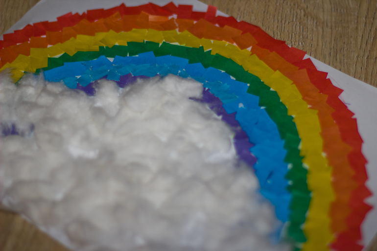 В один из дождливых дней у нас появилась такая радуга...Дело было перед сном, я думала, что часа нам хватит, но процесс нас затянул надолго, периодически детям надоедало, я снова увлекала, особенно, когда в ход пошла вата, и с горем пополам мы ее сделали. Аппликация, конечно, не из легких и требует усидчивости, терпения, чего нам всегда не хватает...