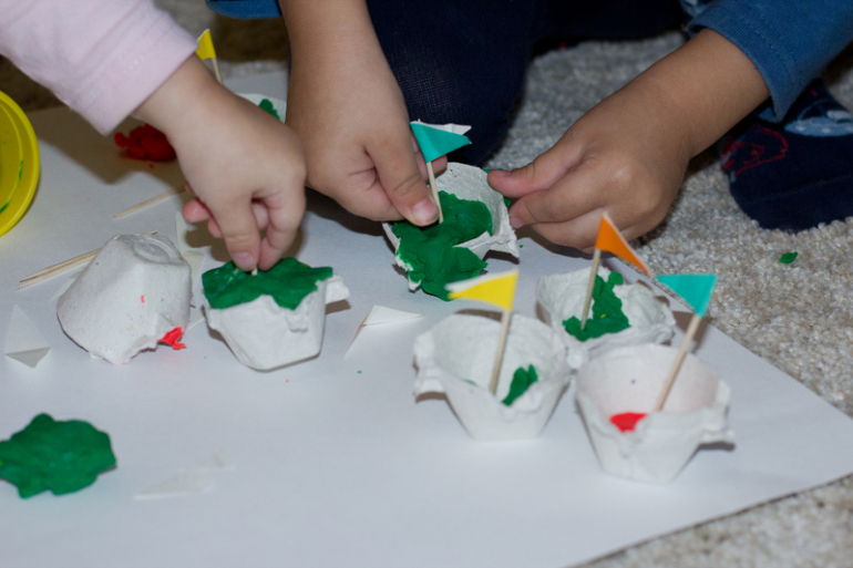 Дело было вечером, делать было нечего и мне под руку попала коробка от яиц...тут же возникла идея о создании флотилии)) Еще нам понадобились: зубочистки, пластилин и цветная самоклеющаяся бумага. Вроде бы просто, а увлекло надолго...