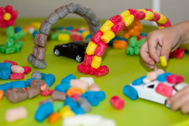 Настоящим открытием для нас стало, приобретение кукурузного конструктора...а всего-то надо: увлажнить, соединить) Так у нас за пару минут появились цветы, мосты, солнце, деревья, Тема сразу же, сделал длинные предлинные бусы, а потом решил обклеить ими все свои модельки, в результате чего понял, что с помощью кукурузы можно делать из обычных машин-полицейские, а сломанным машинам скорой помощи добавить мигалку и дать им вторую жизнь)