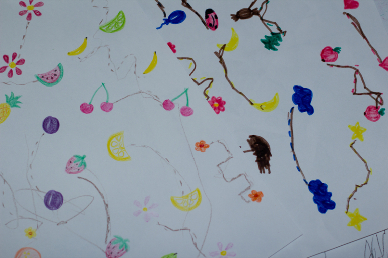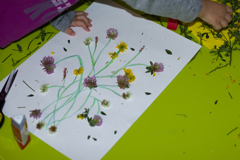 Создавали цветочные клумбы. После такого количества цветов, уже и Амелечка виртуозно справлялась с задачей) Даже Тема уже отошел от этой задачи, а Амелечка упорно клеила оставшиеся...