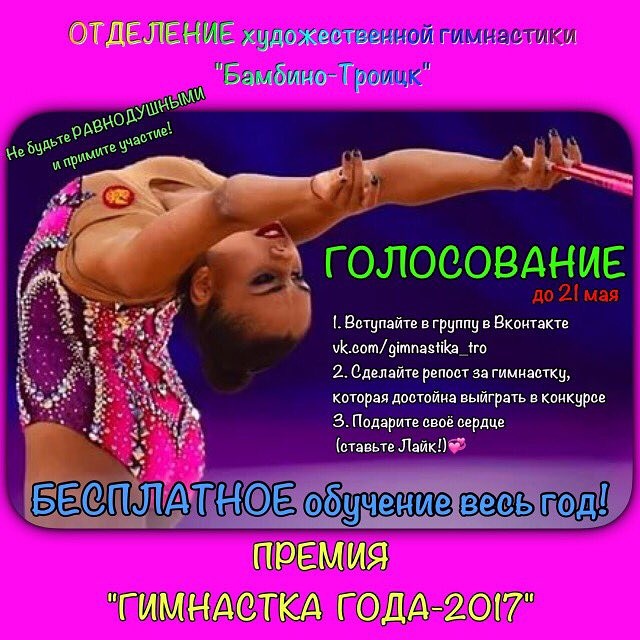 Ребята уделите минутку своего времени и поддержите мою дочку в конкурсе Гимнастка года . Надо всего вступить в группу и поставить лайк под фото Тюрикова Мирослава))) https://vk.com/gimnastika_tro