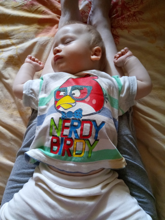 Днём спит 2 раза. По 40мин- 2часа. Укладывается с грудью. Но засыпает без груди. Укачиваю на себе, потом перекладываю. Может по середине сна открыть глаза, закрыть и спать дальше. Ворочается, переворачивается, спит и на спине и на боку и на животе. На ночь по разному укладывается, с грудью обязательно, а дальше может сразу заснуть, а может только через укачивания. Но крепко спит только со мной, уже после 12 ночи. В своей кроватке почти не спит. Только когда папа его вечером укачивает, и с 22 до 24 или чуть позже он в кроватке.