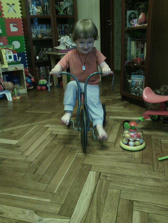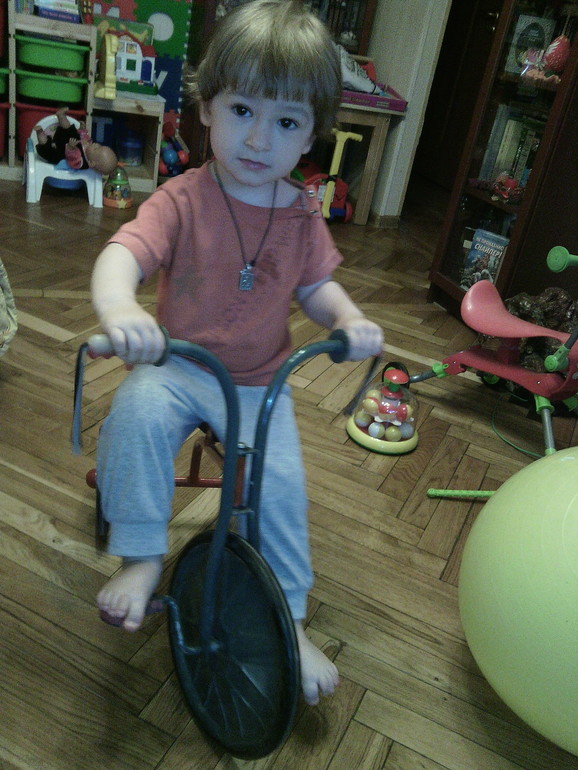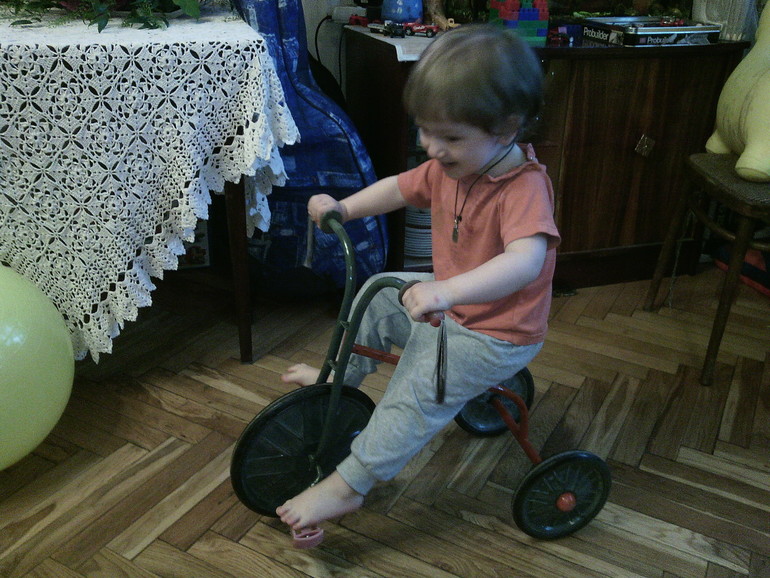Данек растетУра!! Даня научился кататься на велосипеде!!! Очень упорно учился, неделю катался по всей квартире, нажимая только 1 ножкой на педаль, и вот ровно в 2 года и месяц он сам поставил уверенно 2 ножки на педали и поехал!! Теперь рассекает по квартире!!!!
