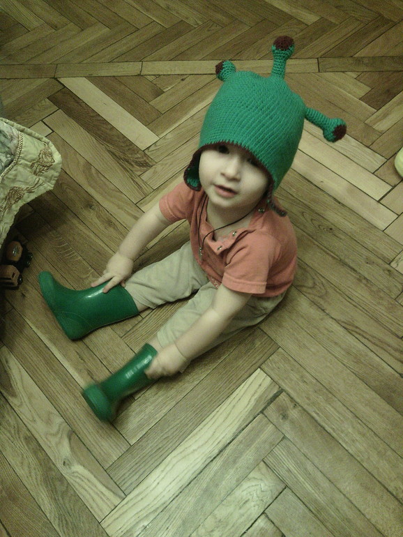 Есть у нас зеленые сапожки резиновые , на весну-лето-осень, еще советских времен, не убиваемые))))), вот связалось им в комплект шапуля-смешнуля))))